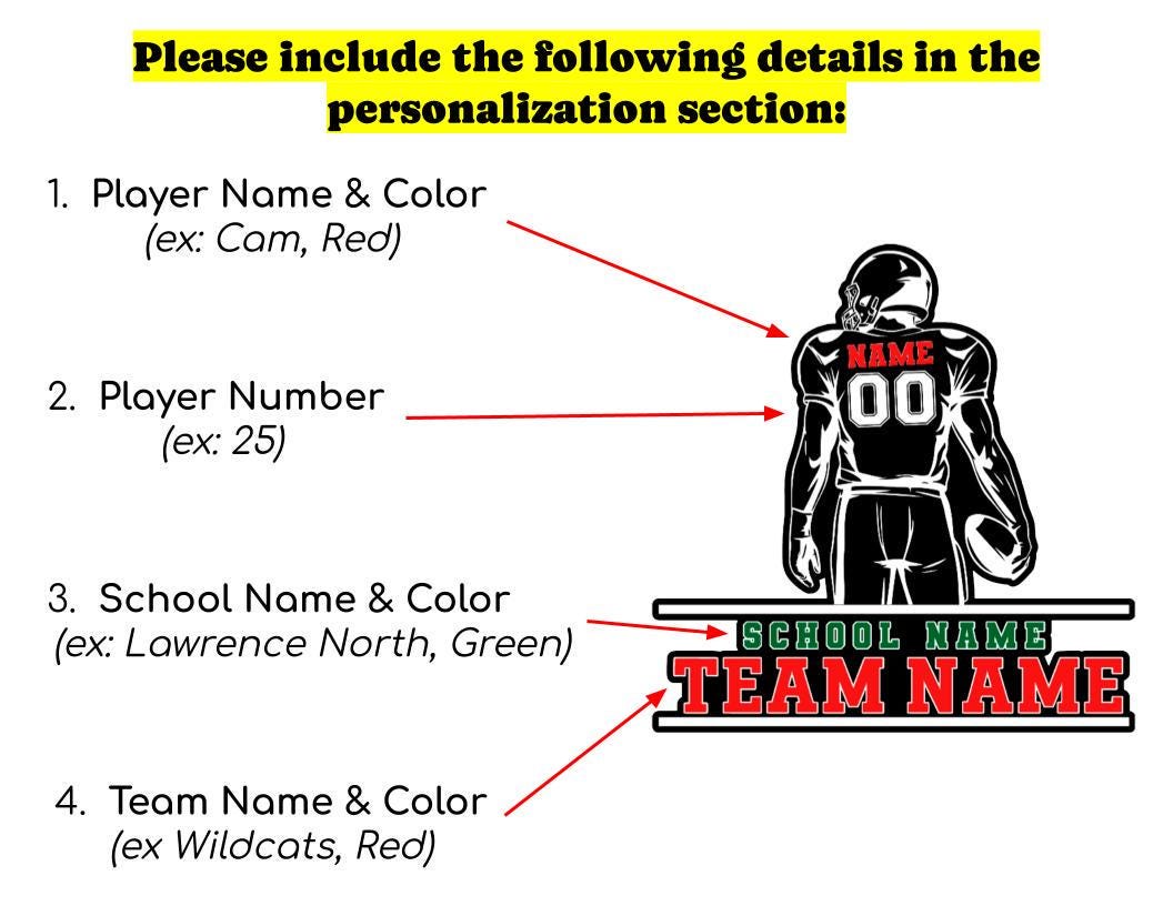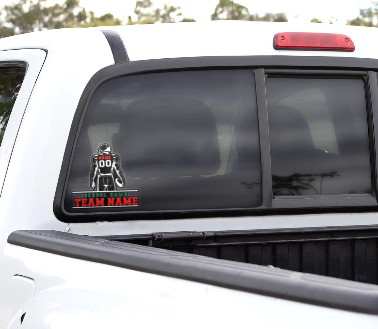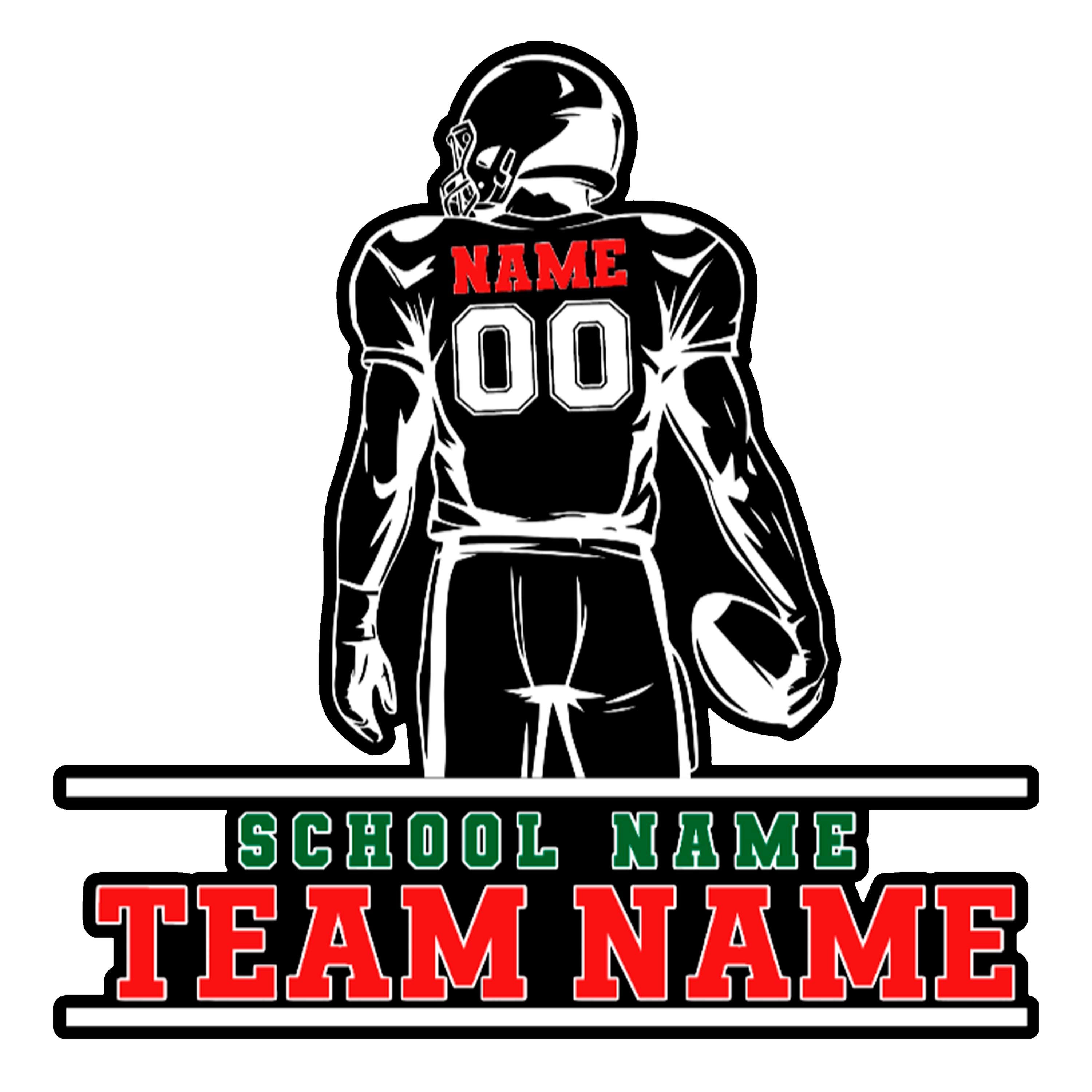 Custom football player car decal is perfect for proud football moms, dads, and fans supporting their athlete on game day. This design features a football player silhouette from the back with customizable name, number, school name, team name, and colors, making it a perfect personalized sports decal.