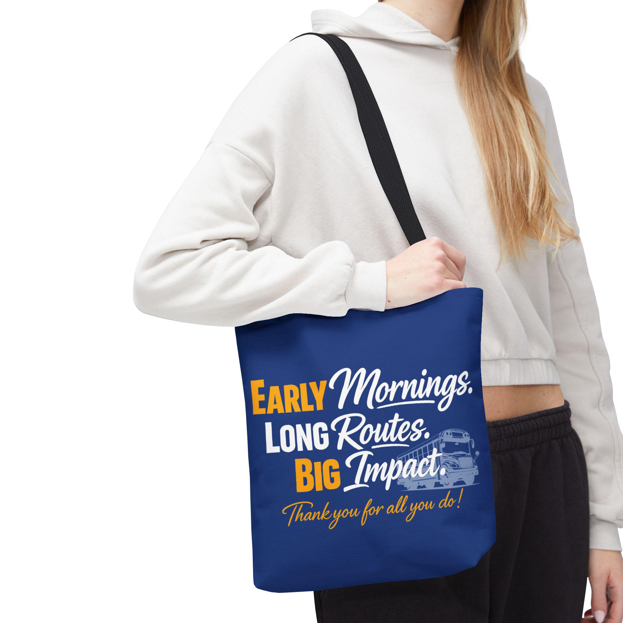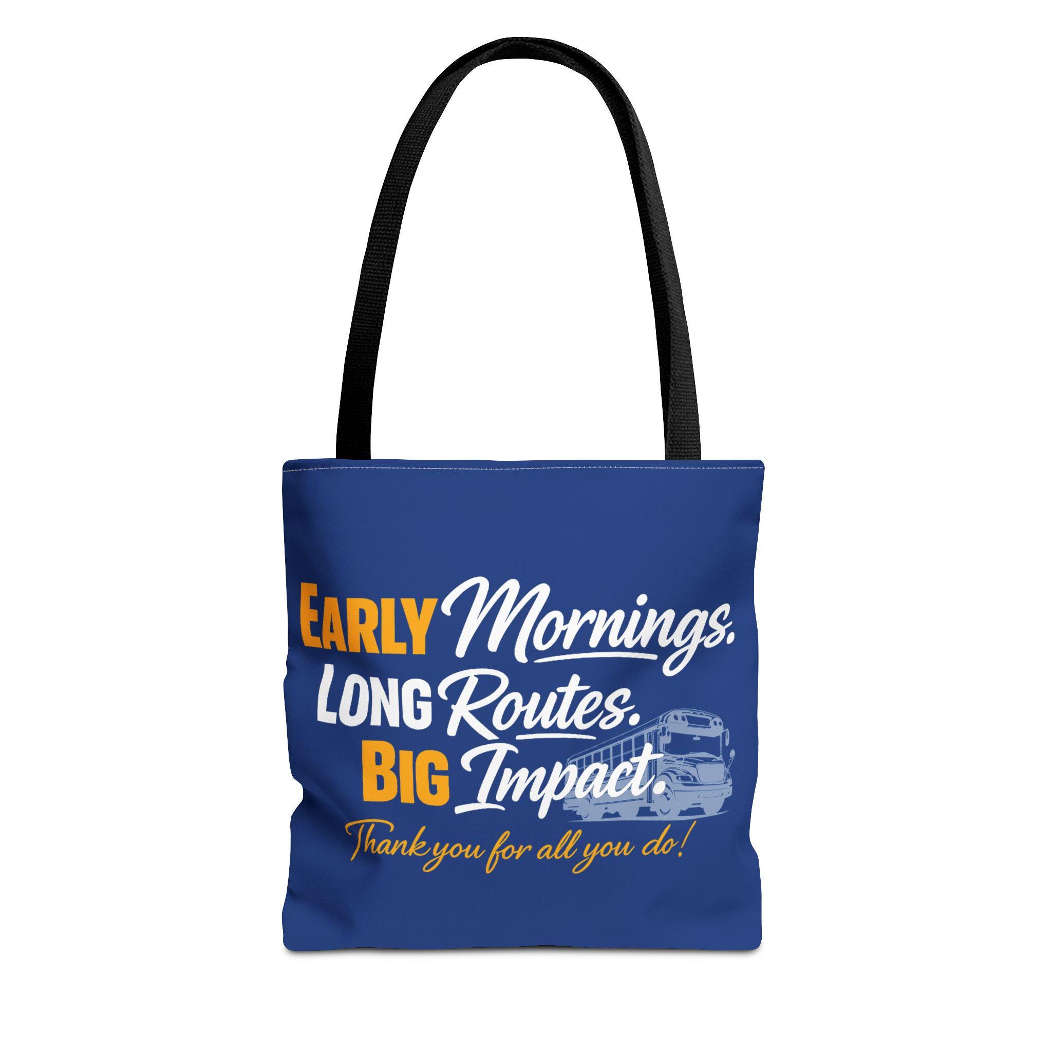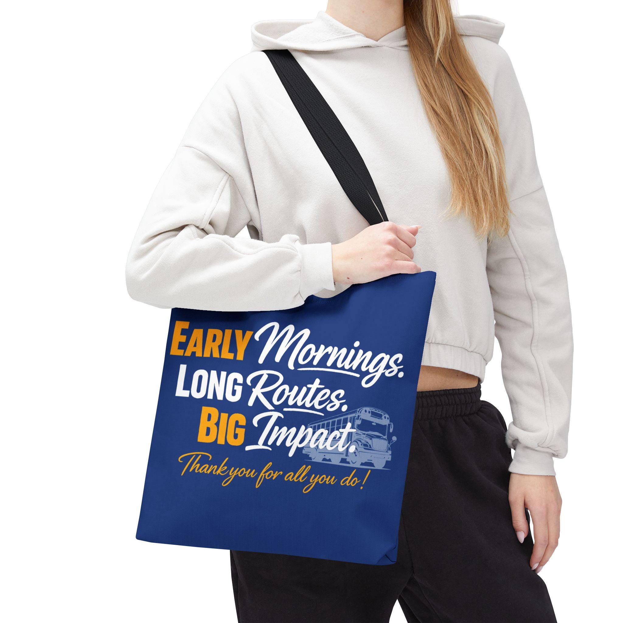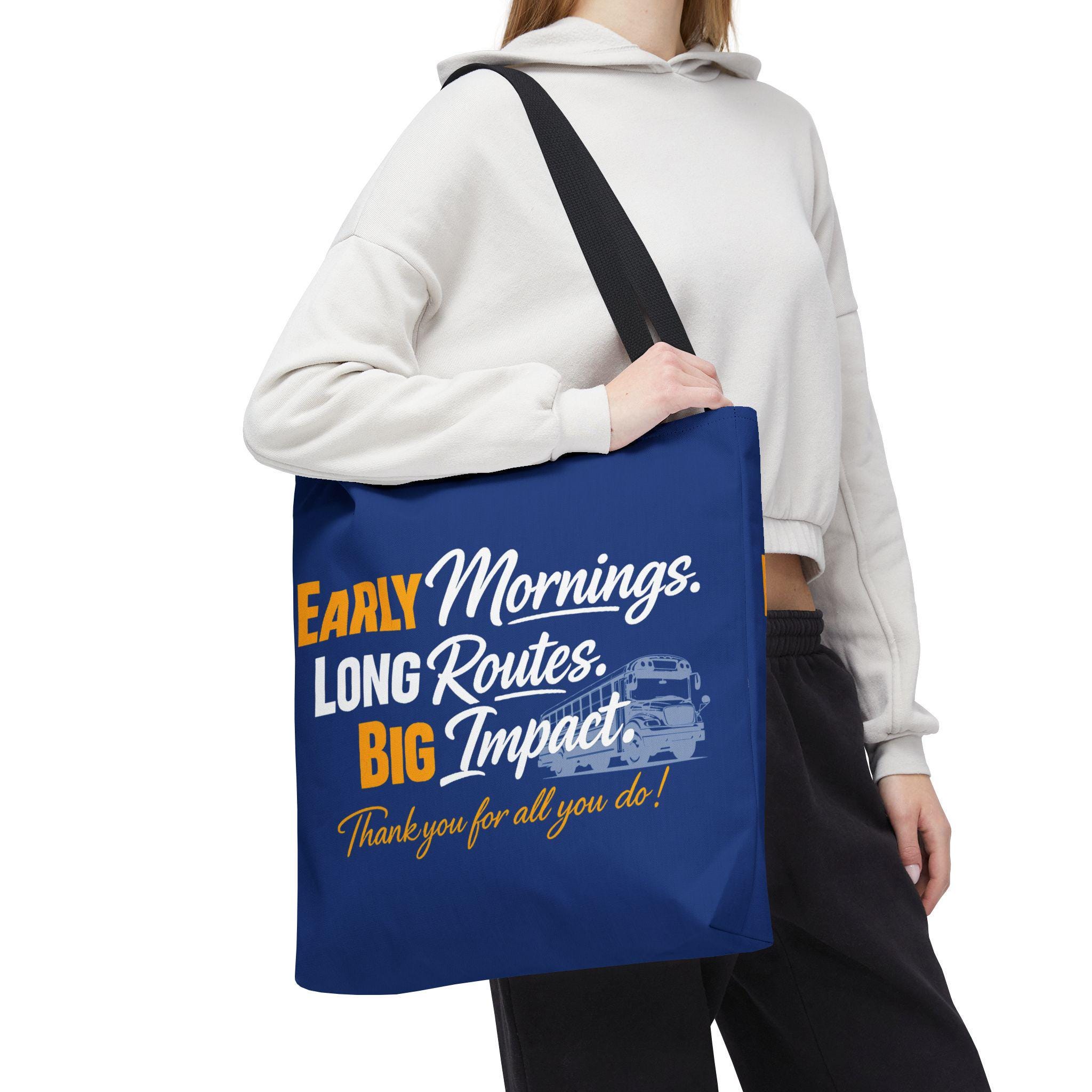 This roomy polyester tote carries more than errands — it carries gratitude. The bold, vintage-inspired lettering reads like a salute: “Early Mornings. Long Routes. Big Impact.” with a subtle school bus silhouette tucked into the corner. The matte black background and warm gold-and-white palette give it a hardworking, no-nonsense vibe that still feels personal. Reinforced handles and boxed corners keep the shape when you load it up, while the water-resistant laminate inside protects paperwork, snacks, or gear. Wear it on the shoulder for a commute, sling it over an arm at the depot, or pack it for a long day of runs — it looks like it belongs with people who put in the miles and deserve thanks for every one of them.
