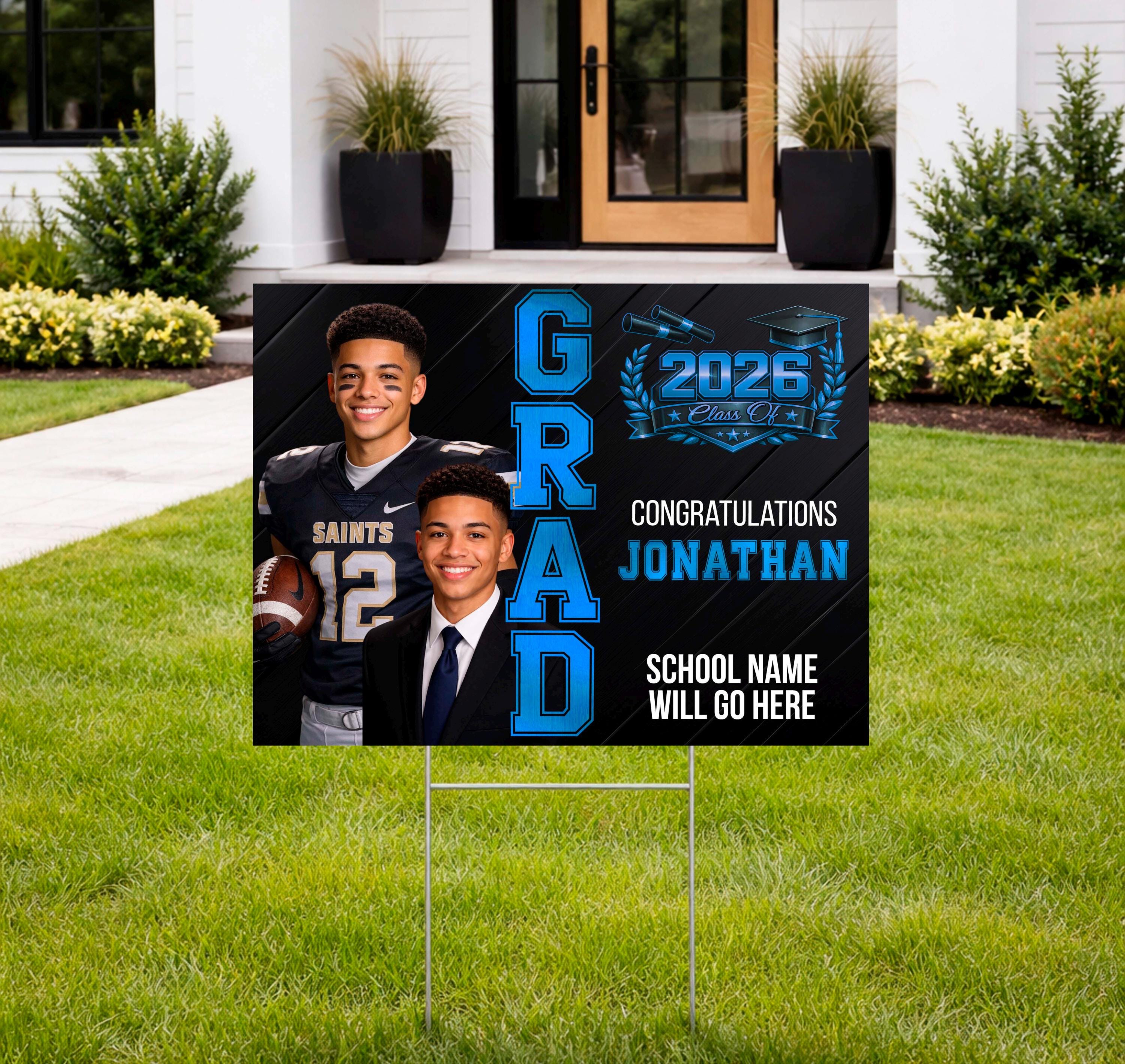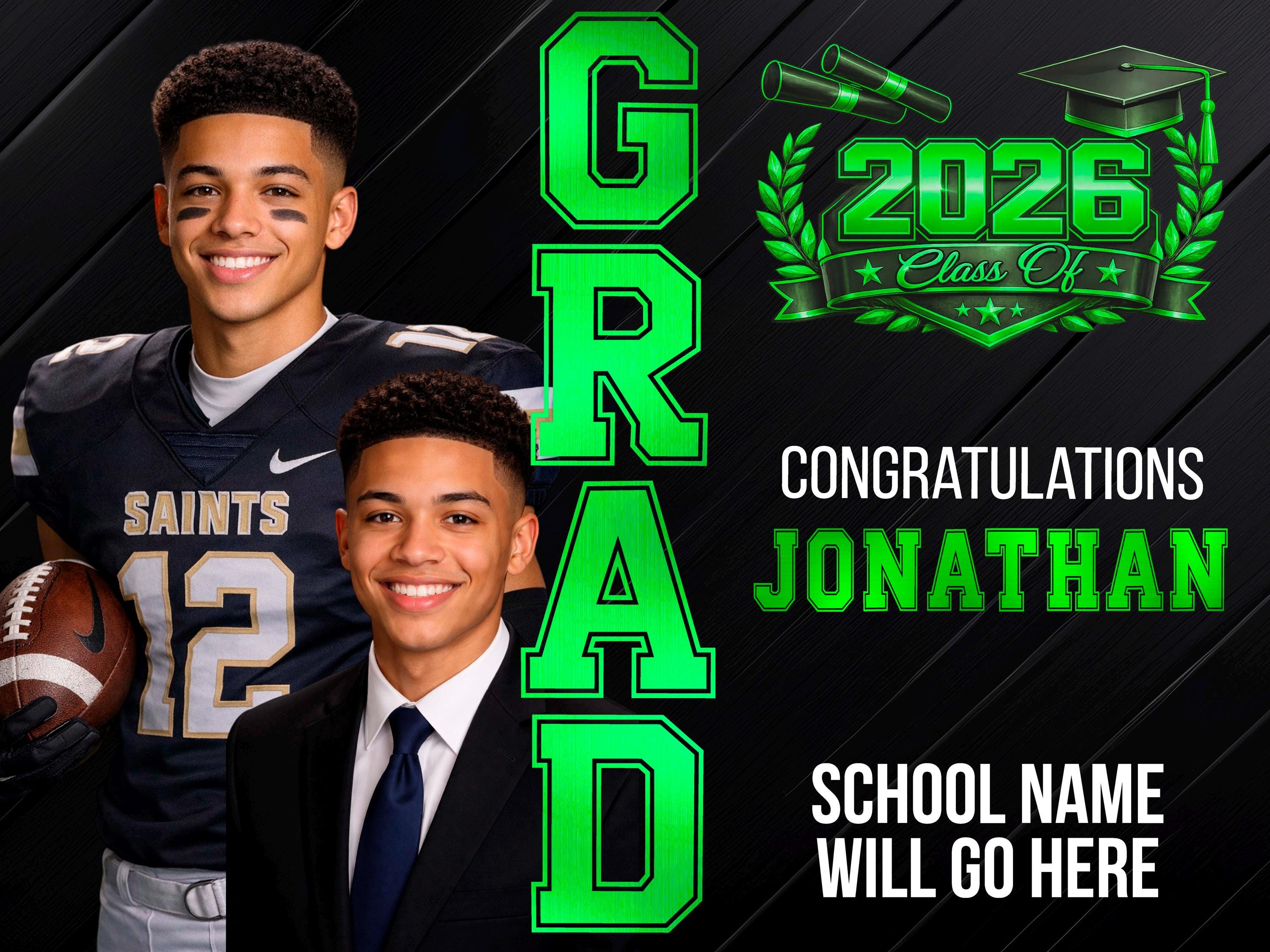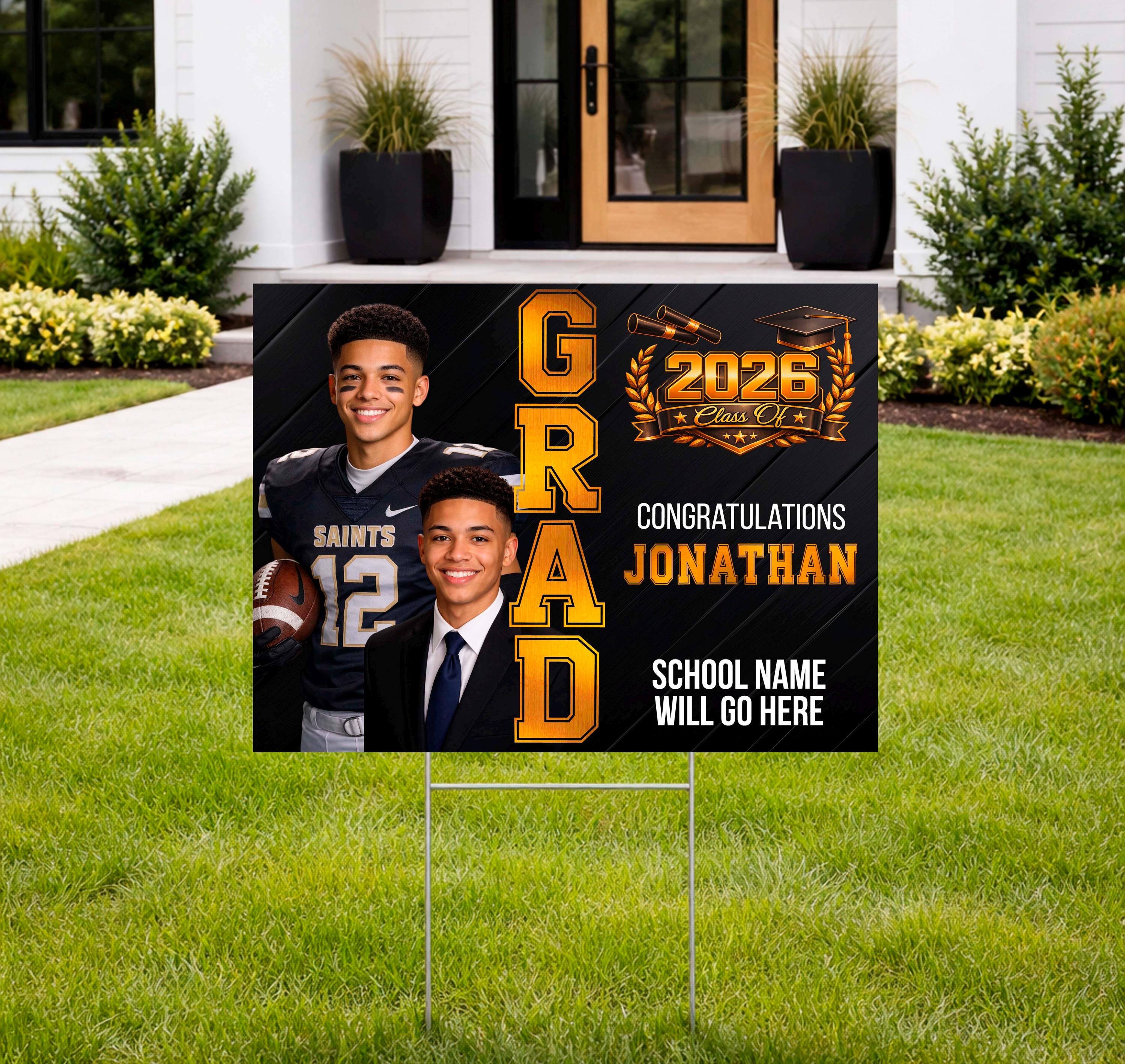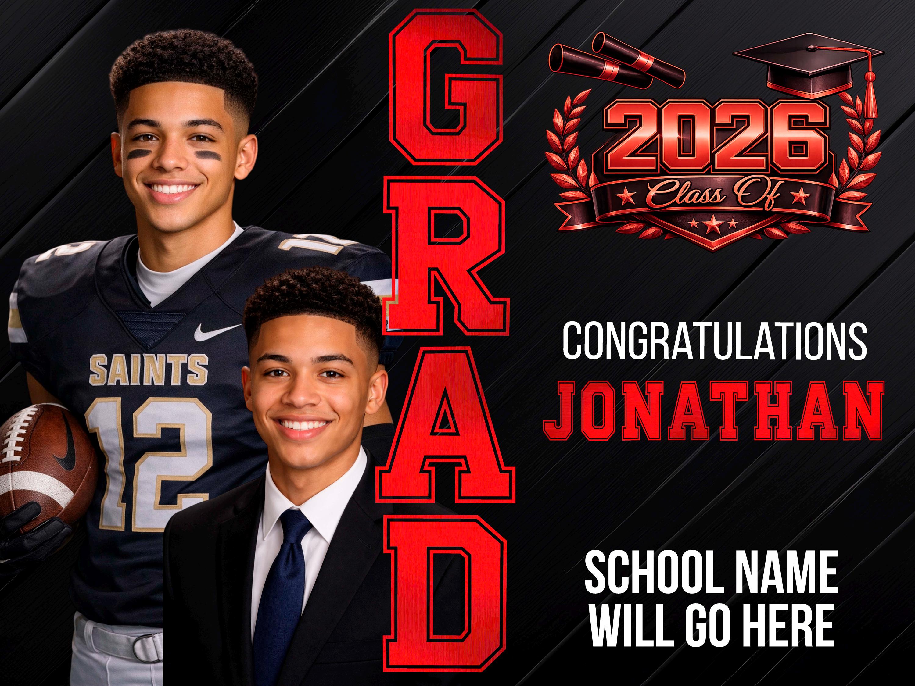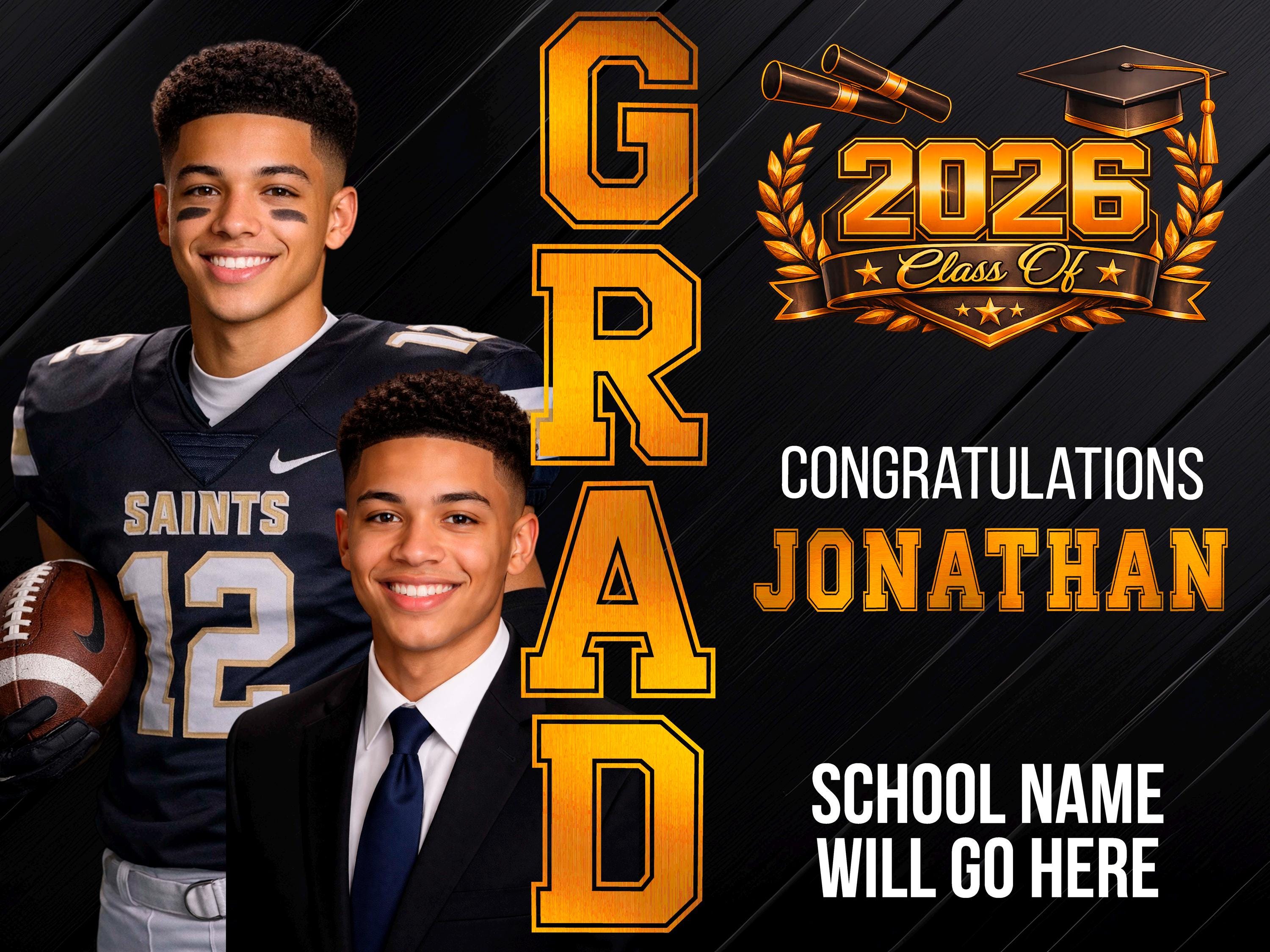 Celebrate your graduate in a BIG way with this eye-catching custom 24” x 18” graduation yard sign! This custom design features a modern, high-impact layout with your graduate’s name, school, and photos — ideal for front yards, parties, or graduation celebrations.